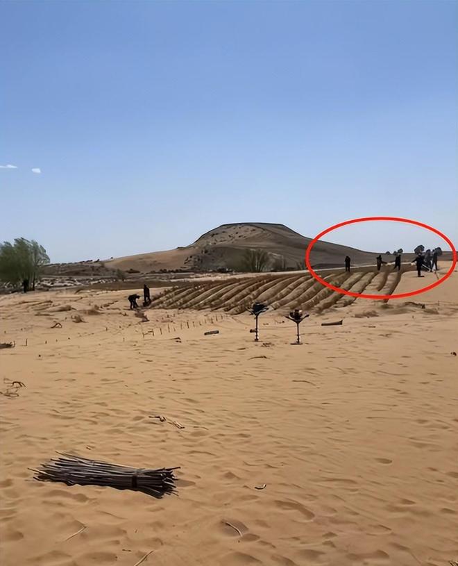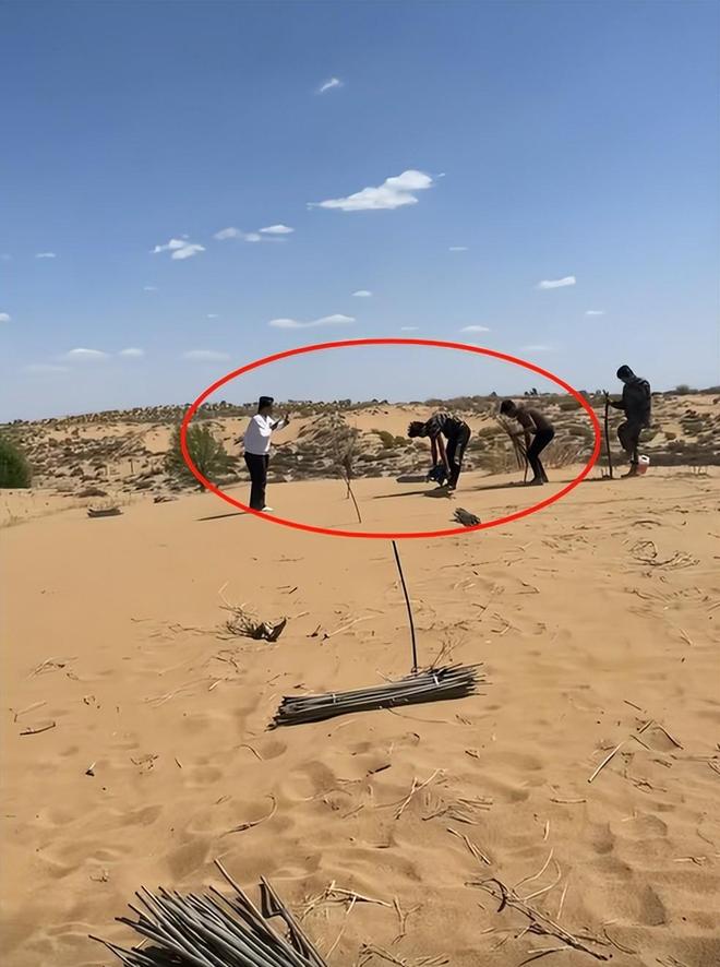 而且正常的植树工人们都是聚在一起互相有个照应,王金和摄影师这几个人却远离了人群,在边缘地带设置防沙树。
