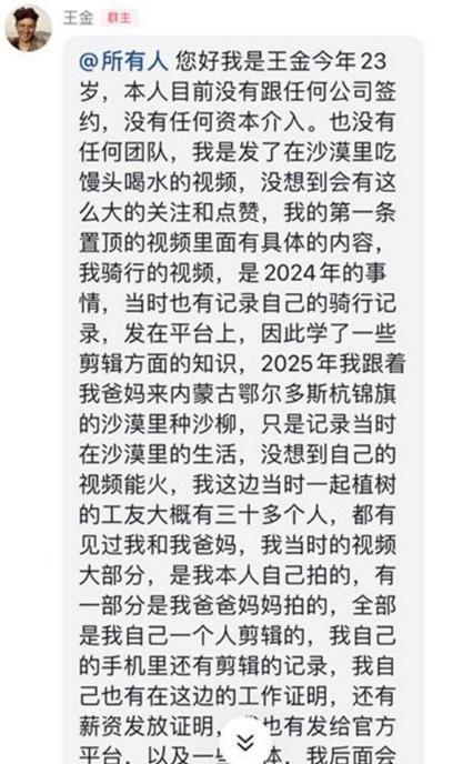 自从爆火之后王金都不止一次在自己的粉丝群中辟谣,说自己没有跟任何公司签约,而且也只是一开始在沙漠发吃馒头喝水的视频,从来没想过自己会这么火。